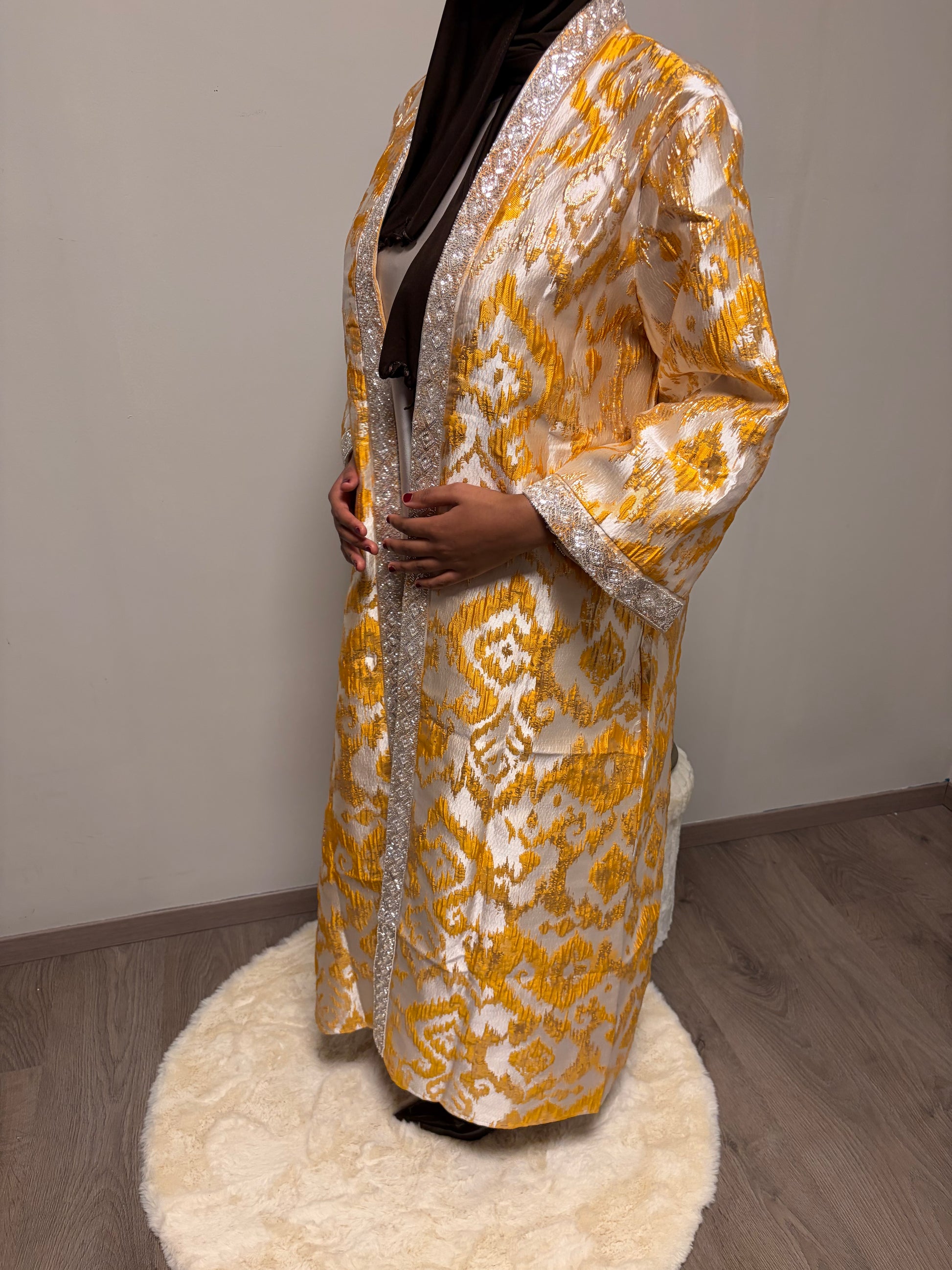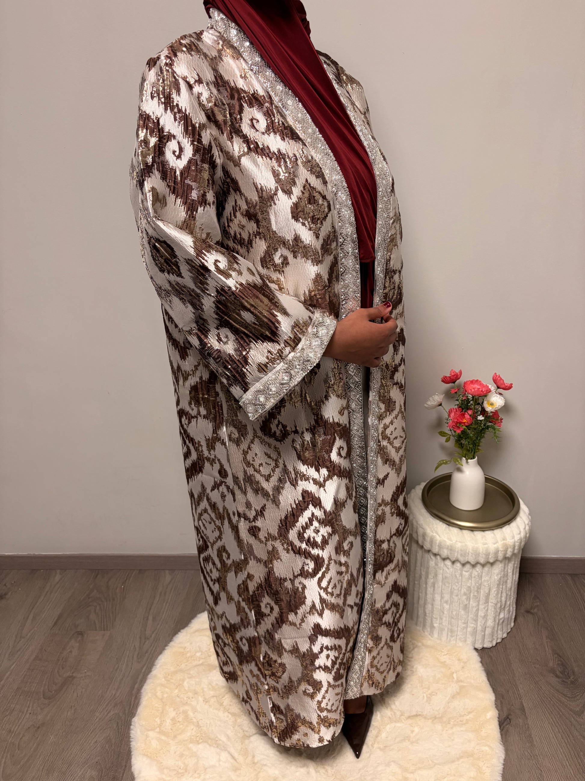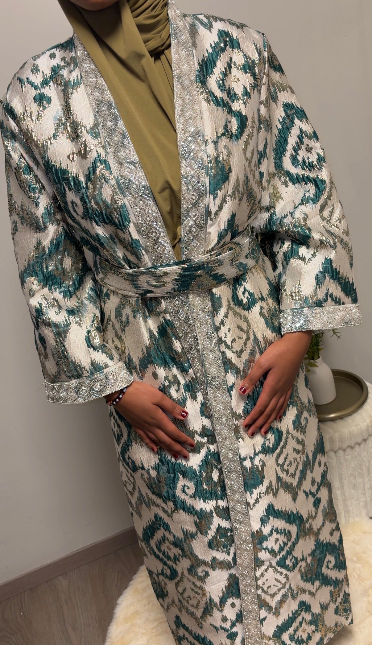 De Imilia Set bestaat uit een lange brokaat kimono met bijpassende onderjurk en een losse riem. De rijke brokaatstof en verfijnde afwerking zorgen voor een luxe en elegante look, perfect voor feestelijke gelegenheden.
