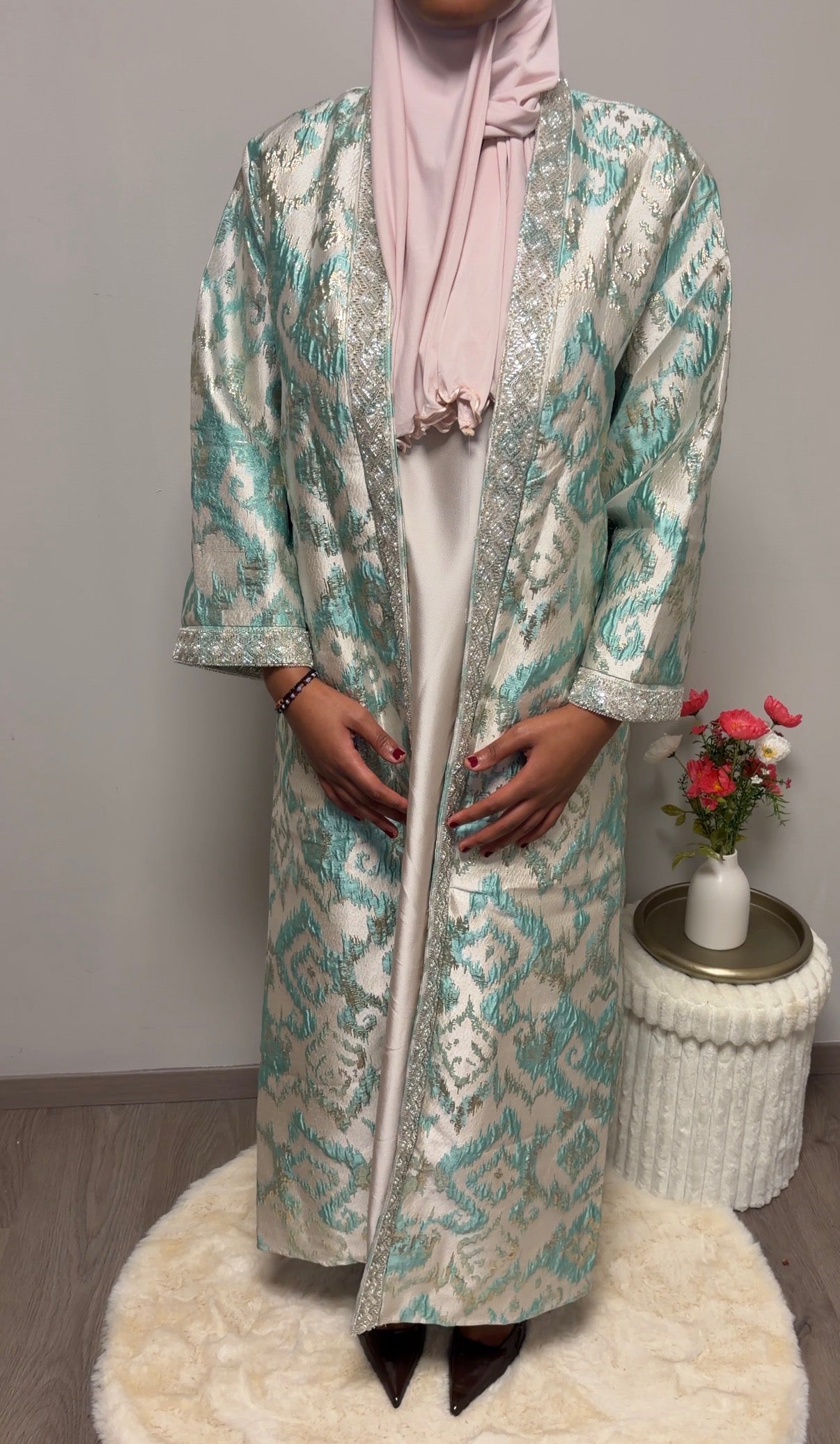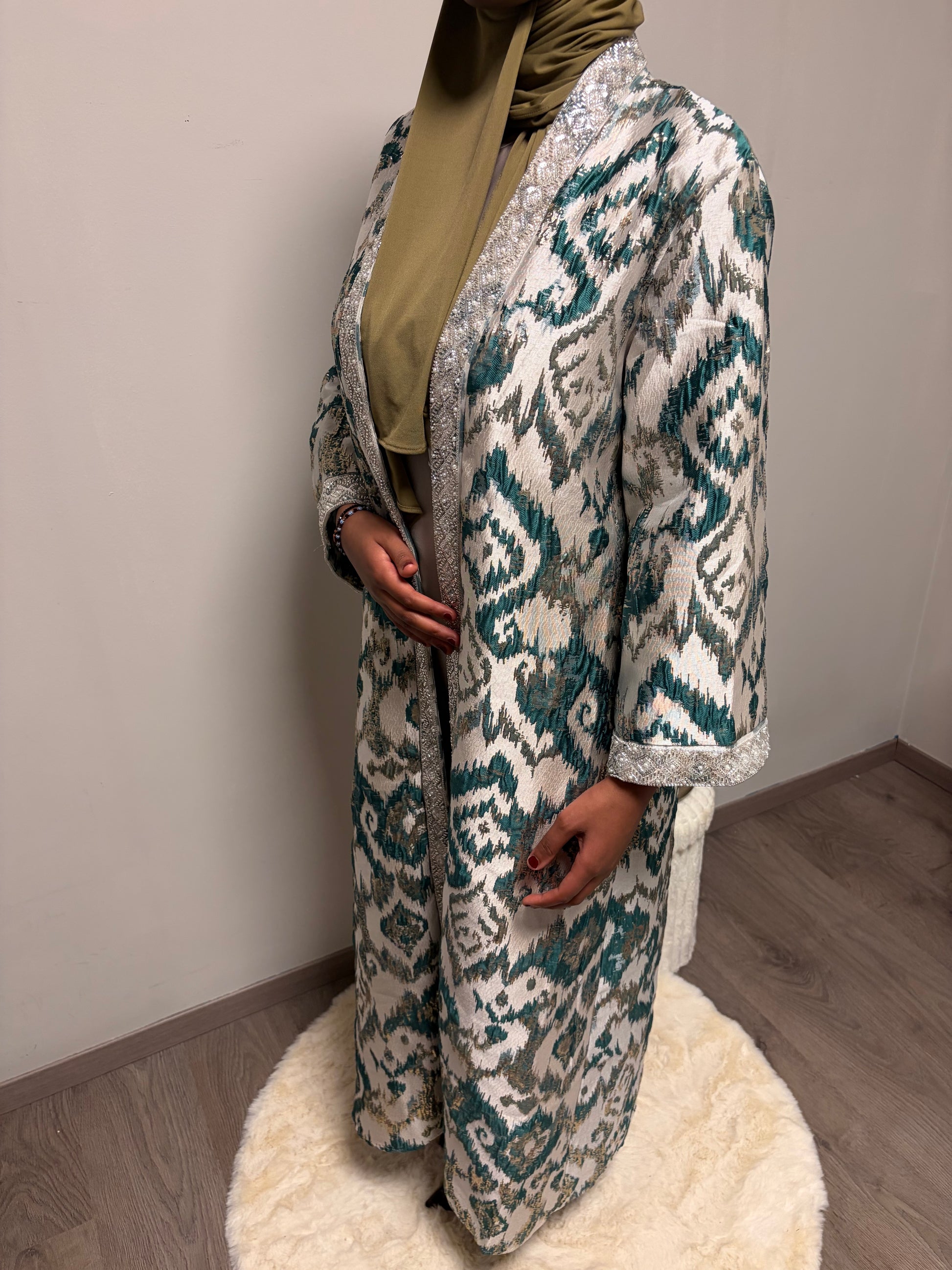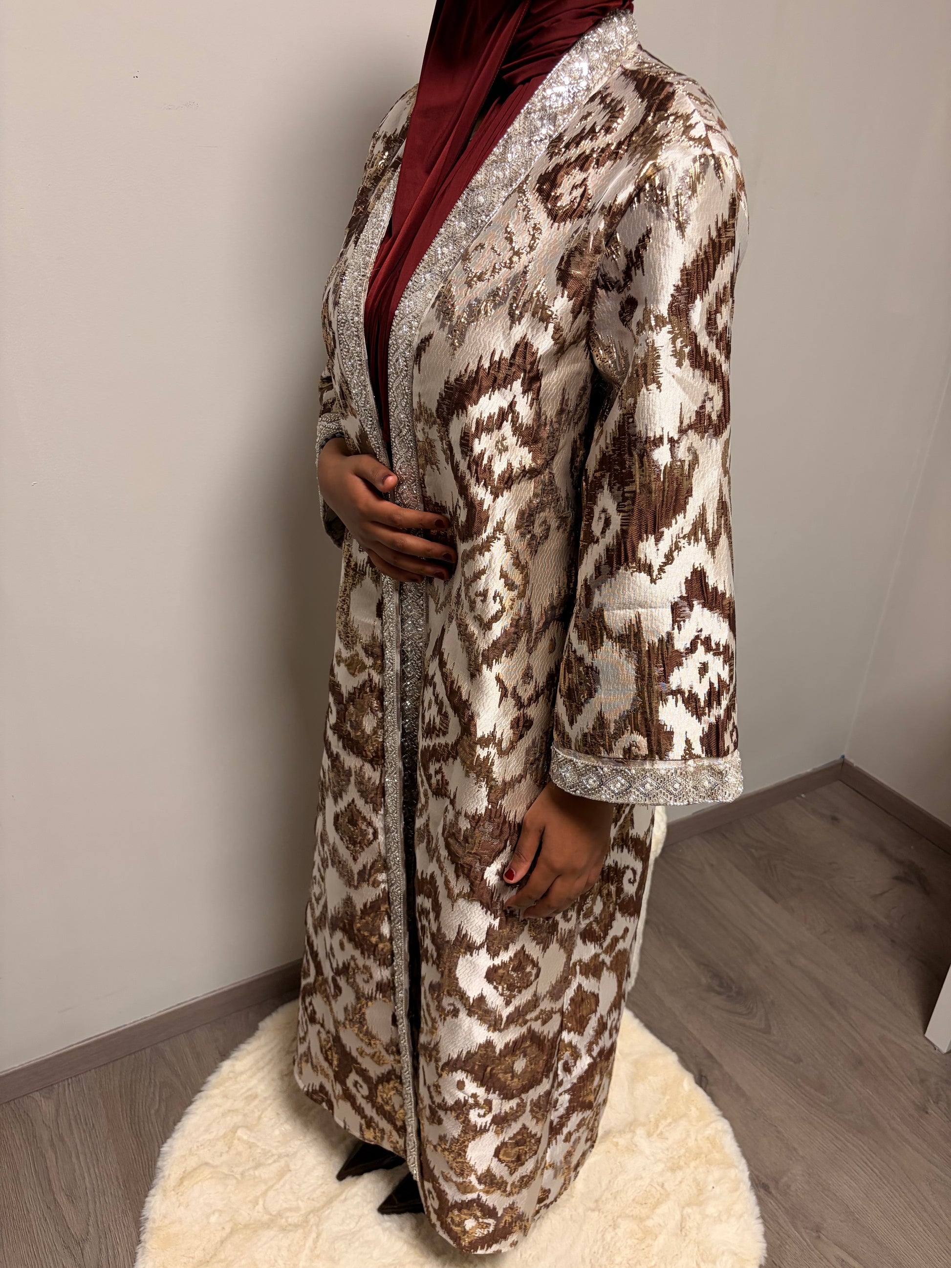 De Imilia Set bestaat uit een lange brokaat kimono met bijpassende onderjurk en een losse riem. De rijke brokaatstof en verfijnde afwerking zorgen voor een luxe en elegante look, perfect voor feestelijke gelegenheden.